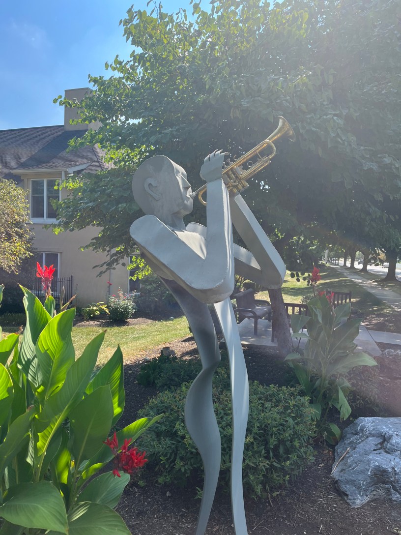As a metal sculpture, this man’s lips are unlikely to function properly, and he probably won’t be able to produce a good trumpet tone. In fact I haven’t heard a single note out of him in the five years he’s been standing here! His horn is in terrible condition after being left out in the elements for half a decade. The odds of success are totally stacked against him.