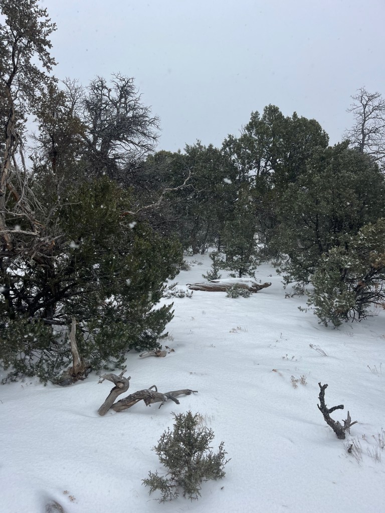 The thing is- the view was every bit as stunning and beautiful as people said it would be, but for obvious reasons, entirely different! We stayed for a while and tried to make out rock formations in the cloud-soaked canyon. The snow and grayness made the whole place look like something out of a Harry Potter movie! Walking the the pathways along the forested rim was so peaceful and quiet, but also scary. It felt like we were totally alone and miles away from civilization. The sunset was setting and the dim daylight we had was quickly disappearing.