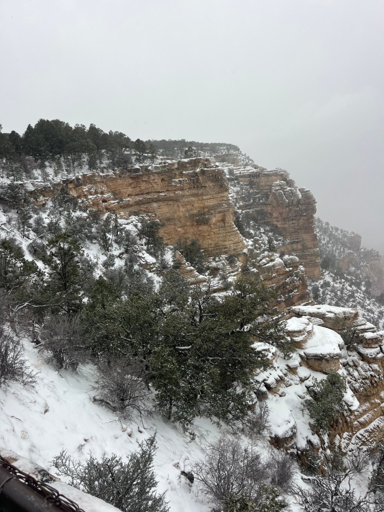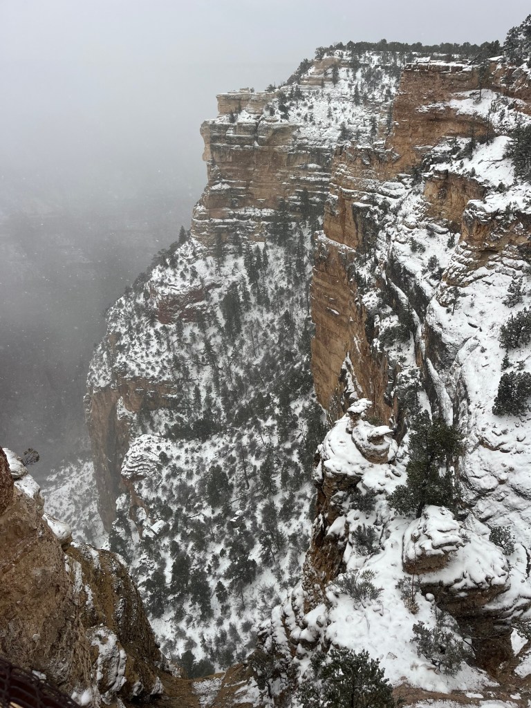 After checking in at Yavapai Lodge, we headed over to the visitor center and Mather Point to see what we could see. It was windy, cold and snowy. Several inches had already piled on the ground. Hardly anybody was out. It was exciting, weird, and a little eerie.