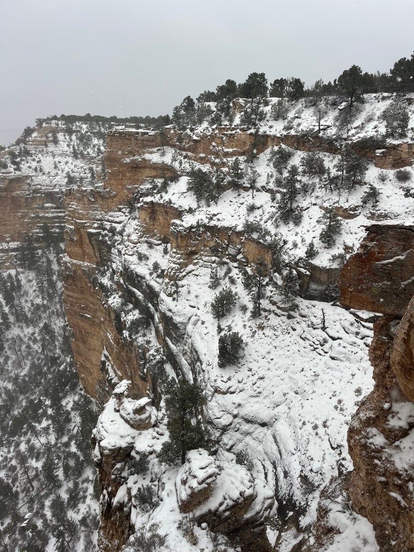 After checking in at Yavapai Lodge, we headed over to the visitor center and Mather Point to see what we could see. It was windy, cold and snowy. Several inches had already piled on the ground. Hardly anybody was out. It was exciting, weird, and a little eerie.